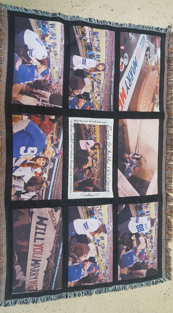 One side has 9 individual photo panels. The soft, customized throw could be used as a decoration or a memorable keepsake gift. The fringe on this blanket is multi-colored, mainly brown and white. 35″ x 54″ Can be customized horizontally or vertically.